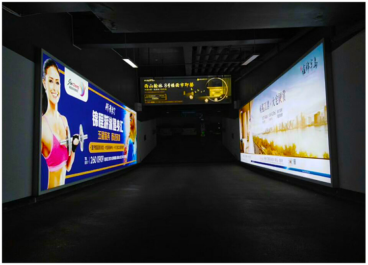 亮麗的停車場室內(nèi)廣告拉布燈箱—該項(xiàng)目由我司提供鋁型材、LED燈、畫面以及技術(shù)安裝指導(dǎo)(不含安裝),全部燈箱都以墻面壁掛式展現(xiàn),燈箱安裝的完成的同時(shí)普通的停車場也升級(jí)形成了一道亮麗的廣告風(fēng)采!