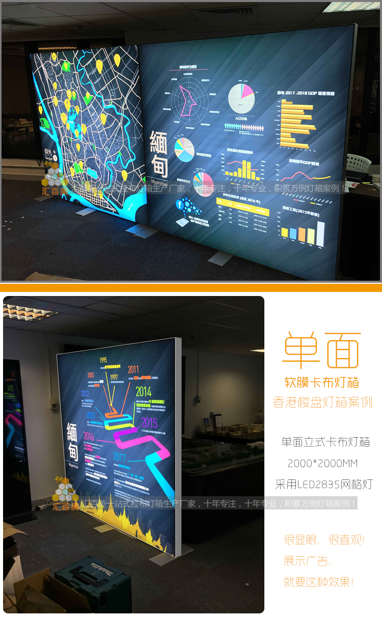 案例說明:我司與香港某樓盤中心合作案例——80mm卡布燈箱應用,以立式的展示方式用于樓盤中心的樓盤平面圖及數(shù)據(jù)展示,高端的品牌采用高亮節(jié)能式卡布燈箱讓整個店鋪彰顯出高貴與奢華、高調(diào)與端莊。