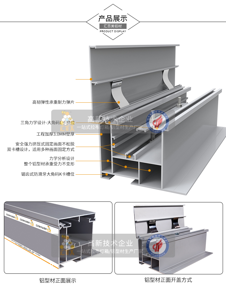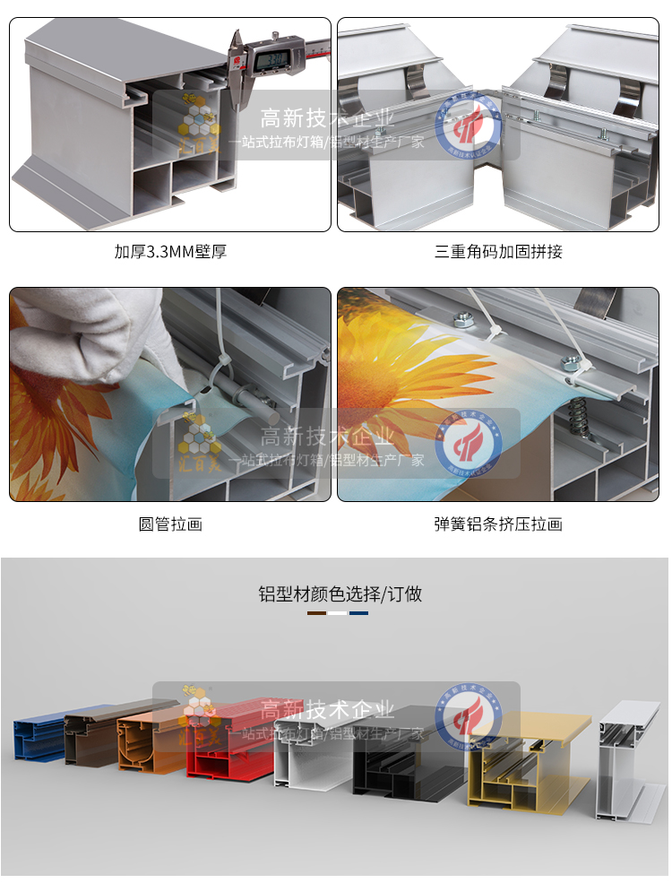 產(chǎn)品簡介:加厚加強(qiáng)版投標(biāo)工程拉布燈箱型材,是專門針對≥150㎡以上的燈箱設(shè)計的,承重力強(qiáng)!可以承接300㎡左右的大型拉布燈箱,該款型材壁厚達(dá)到3.3mm,表面6層陽極氧化處理,承重不變形!大型戶外工程廣告投標(biāo)項(xiàng)...