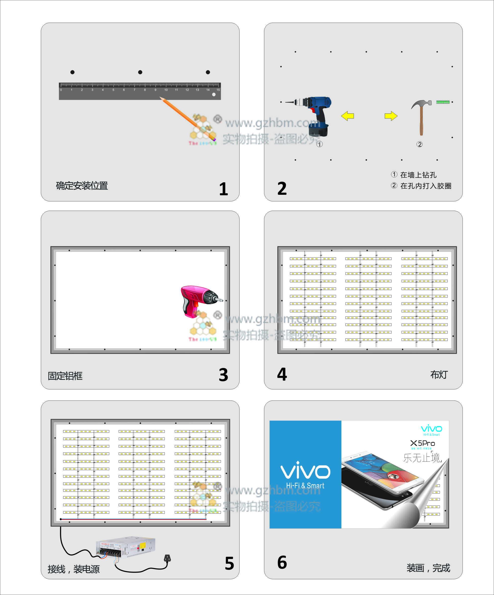 4:接線出線——LED燈/電源器電線分別相應(yīng)對(duì)接,最后在鋁框底部出電源線。