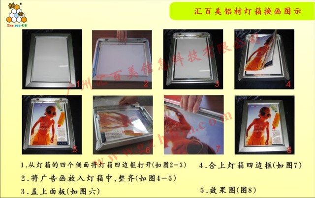 2:四邊開啟式:這種方式一般是用在鋁材燈箱,也是一種非??旖萃瓿傻膿Q畫方式,您只要將燈箱四邊框打開,然后取下面板,將畫取出,然后再換新的進(jìn)去就可以了,整個(gè)換畫過程也花不了1~3分鐘。