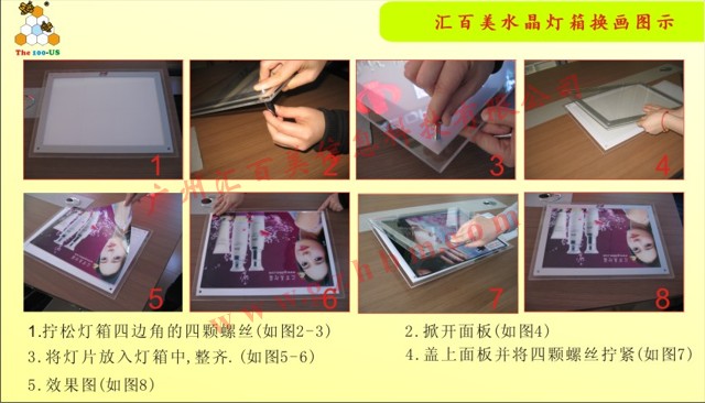 3:水晶燈箱換畫式:這個(gè)我覺得可能相對(duì)麻煩一點(diǎn)點(diǎn),別的不說(shuō),燈箱已經(jīng)安裝的墻上的話,換畫時(shí)得擰開最少2邊的廣告螺絲,有些情況還得擰開4個(gè)邊角的螺絲才可完成,相對(duì)來(lái)說(shuō)時(shí)間上應(yīng)該是比較久了,因而覺得這種方式比較費(fèi)時(shí)一點(diǎn)。