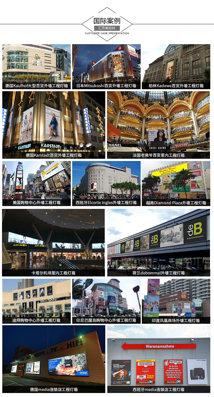 匯百美十年來專注于為客戶提供工程拉布燈箱一站式服務(wù),提供包括燈箱鋁型材、LED燈、廣告畫面、電源器的一站式采購(gòu)。
